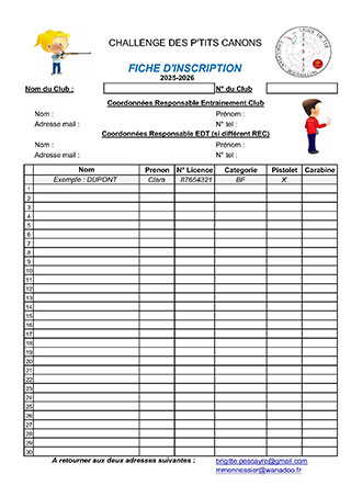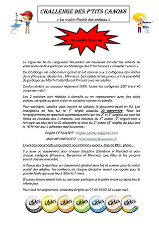Inscriptions Challenge des P'tits Canons Circulaire Challenge P’tits Canons Cliquez ici pour afficher le PDF Fiche d’inscription Cliquez ici pour afficher le doc Championnat Régional 10 / 18 m Circulaire Régional 10 / 18 m Cliquez ici pour afficher le PDF Cliquez ici pour afficher le PDF Fiche Equipe Mixte PISTOLET Cliquez ici pour afficher le doc Fiche Equipe Mixte CARABINE Cliquez ici pour afficher le doc Cliquez ici pour afficher le PDF Match Postal Marcel Primard 2025/2026 Règlement Match Postal Cliquez ici pour afficher le PDF Fiche d’inscription Cliquez ici pour afficher le doc Copyright © 2025 Ligue de Tir du Languedoc Roussillon Site web réalisé par: SID34