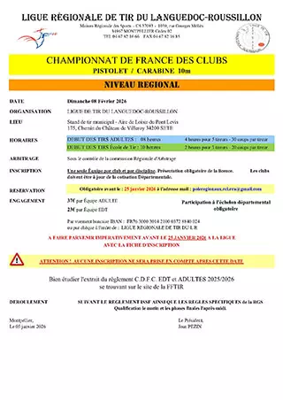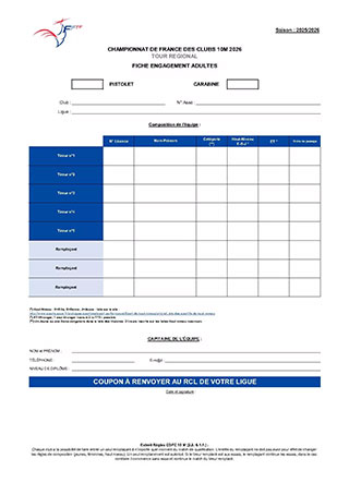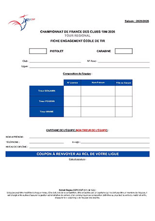 Inscriptions CDF des Clubs 10m Tour Régional Circulaire CDFC 10m Régional Cliquez ici pour afficher le PDF RGS CDF des Clubs 10m Cliquez ici pour afficher le PDF Fiche d’engagement ADULTES Cliquez ici pour afficher le doc Fiche d’engagement EDT Cliquez ici pour afficher le doc Stage Découverte Silhouettes Métalliques Stage découverte SM Cliquez ici pour afficher le PDF Challenge des P'tits Canons Circulaire Challenge P’tits Canons Cliquez ici pour afficher le PDF Fiche d’inscription Cliquez ici pour afficher le doc Match Postal Marcel Primard 2025/2026 Règlement Match Postal Cliquez ici pour afficher le PDF Fiche d’inscription Cliquez ici pour afficher le doc